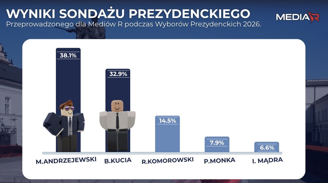 WARSZAWA – Redakcja Media R zakończyła zbieranie głosów w najnowszym badaniu opinii publicznej. Czytelnicy portalu wzięli udział w głosowaniu na temat: Gdyby wybory prezydenckie odbyły się dzisiaj, na którego kandydata oddałby Pan / oddałaby Pani swój głos?. Wyniki rzucają nowe światło na aktualne nastroje społeczne. Analiza danych wskazuje na wyraźną polaryzację opinii, jednak z wyraźną przewagą jednej z opcji. Największe poparcie uzyskała odpowiedź ANDRZEJEWSKI Miłosz, na którą wskazało 2900 respondentów, co stanowi 38.1% wszystkich głosów. Szczegółowe zestawienie wyników: • ANDRZEJEWSKI Miłosz: 38.1% poparcia (2900 głosów) • KUCIA Bartosz: 32.9% poparcia (2500 głosów) • KOMOROWSKI Robert: 14.5% poparcia (1100 głosów) • MONKA Paweł: 7.9% poparcia (600 głosów) • MĄDRA Izolda: 6.6% poparcia (500 głosów) Eksperci Media R podkreślają, że tak wysoka frekwencja w sondażu (7600 oddanych głosów) świadczy o dużej wadze problemu dla opinii publicznej. Głosowanie trwało przez ostatnie dni i było dostępne dla wszystkich zweryfikowanych użytkowników portalu. Dziękujemy za udział w badaniu. Media R kontynuuje cykl sondaży obywatelskich, aby dostarczać rzetelnych informacji o głosie społeczeństwa. Zapraszamy do śledzenia kolejnych analiz.