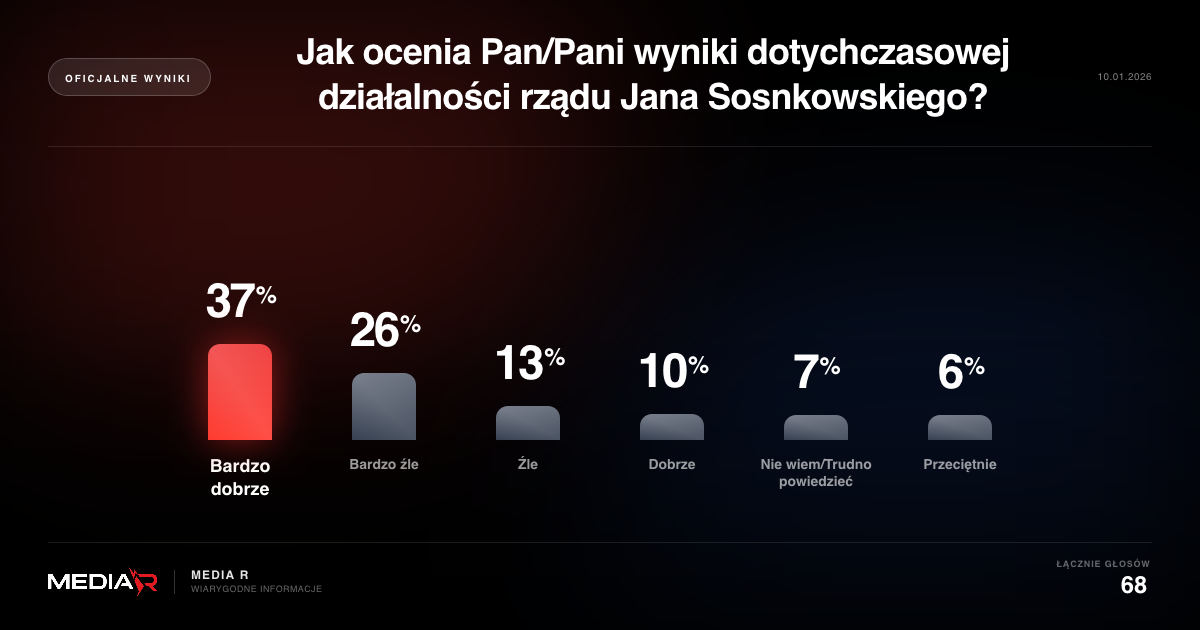 Oficjalne wyniki badania opinii publicznej z dnia 10 stycznia 2026 roku wskazują na wyraźną polaryzację nastrojów społecznych wobec rządu Jana Sosnkowskiego, gdzie największą grupę respondentów stanowią osoby oceniające jego działalność bardzo dobrze (37%), podczas gdy oceny zdecydowanie negatywne wystawiło 26% ankietowanych. Łączne poparcie dla rządu, obejmujące noty „bardzo dobrze” i „dobrze”, ukształtowało się na poziomie 47%, natomiast suma ocen negatywnych („źle” oraz „bardzo źle”) wyniosła 39%. Pozostała część uczestników sondażu oceniła wyniki prac gabinetu jako przeciętne (6%) lub nie potrafiła sformułować jednoznacznej opinii (7%).
